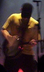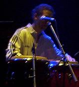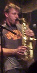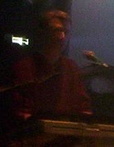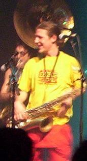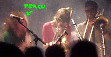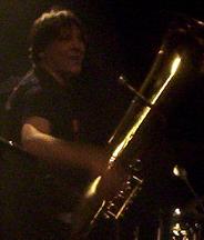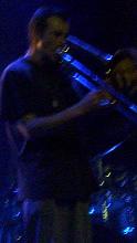 Il y a un autre choeur derrière la batterie, celui-ci était vraiment caché et je n'ai pas pu l'observer. Il y a aussi un tuba, qui m'a l'air d'être un bon leader du groupe, il s'appelle Serge, il bouge pas mal sur scène, se retrouvant tour à tour un peu devant ou derrière, il a l'air d'apprécier fortement la scène, contrairement au guitarriste, qui m'a l'air talentueux, qui avec sa tête de ... souris .. Michael J.Fox avec vingt ans de plus. Il va rester dans l'ombre de la scène, d'ailleurs, j'ai eu trop de mal à le prendre en photo.
