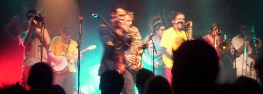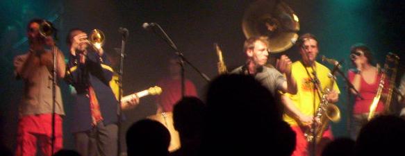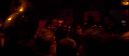 La lumière s'éteint, on attend le concert, le public est chaud et acclame déjà le groupe, quand on entend venir de derrière nous des premières notes. Les musiciens sont dans la foule, on les laisse passer (avec du mal, des fourmis ayant installer leur campement sur ma jambe), il y a deux trombonnes et deux trompettes qui se fraient, pas trop avec douceur quand même, un chemin dans le public pour monter sur scène.