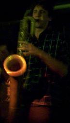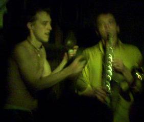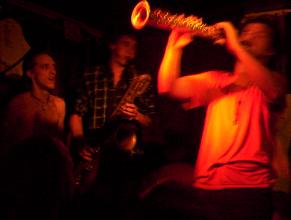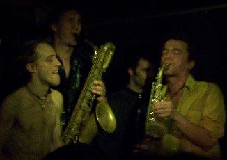 Donc la fanfare regroupe sept musiciens maintenant, de gauche à droite, Mathias, qui joue du Derbouka, et autres percussions, ensuite, il y a le géant Tom, qui porte bien son prénom, avec son saxophone géant et soprano. A sa gauche, Manuel, cheveux dans tous les sens jouant du saxophone alto, le saxophone que l'on peut considérer normal. Ensuite, il y a David le trompettiste, puis Grégoire dont j'ai déjà causé, puis caché derrière son soubassophone, Manu et son physique et visage très germanique. Puis enfin vient, aussi bloqué par son instrument encombrant, Jérémie.