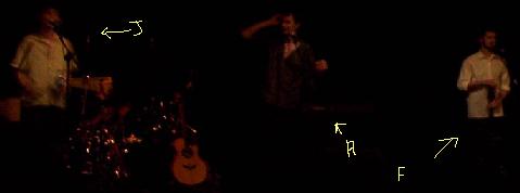 J'écris ces lignes plus d'une semaine après le concert, donc je ne me souviens plus de tout le concert (ça m'arrive souvent en ce moment), mais je promets un bon résumé pour le concert qu'ils vont faire au mois de mars au Mans même (si j'avais su qu'ils repasseraient pfoulalalaaa). Bref, leur musique est faite par un batteur, un guitarriste et un bassiste, et le chanteur chante, logique, les trois autres forment un choeur pas formidable, mais tellement comique.