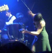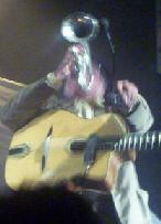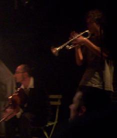 Aussi, pendant le concert, la guitarre s'est désaccordée et ça a duré un long long moment, et du coup on a eu du rab' avec le violonniste et l'accordéonniste et le batteur qui se débrouillaient pour pas qu'on se refroidisse, c'n'était pas agréable, et à un moment, un type du public est monté et a pris le cor (dans lequel souffle le guitarriste parfois pour faire du bruit surtout, mais là le guitarriste était occupé), donc il a pris le cor/trompette pitetre et il a joué quelques minutes en attendant l'accordage, et là, ça a décuplé l'ambiance, mais mon frère a remarqué que ça avait pas trop plu au groupe cette intervention ... m'enfin .. (j'ai la photo !! un peu sombre il est vrai)
