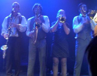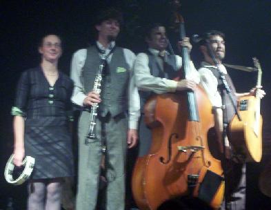 Un gros trip musical, le public est en furie, le saxo se mêle aux trompettes, qui se mêlent à la guitarre, puis à la clarinette, tout ça sous les bruits de la batterie, accompagnée d'une contre basse folle, et ne l'oublions pas, l'accordéon. Ils sont tous en train de bouger, on remarque surtout l'accordéoniste, petite, et sur le devant de la scène, et aussi, je l'avais oublié, le violonniste, et hop, ça continue, un trip total sur une musique qui te fait vibrer tous les poils de ton corps. On saute, on crie de joie, le concert est parti, c'est la joie !!! d'la joie sauvage.