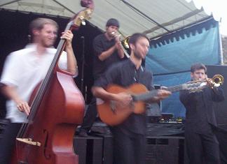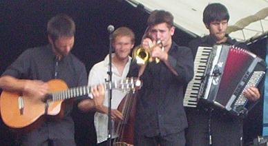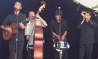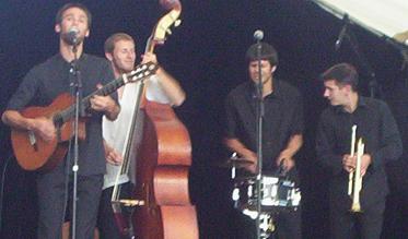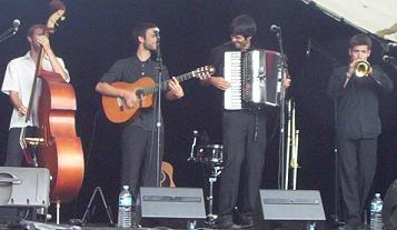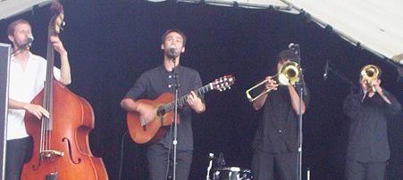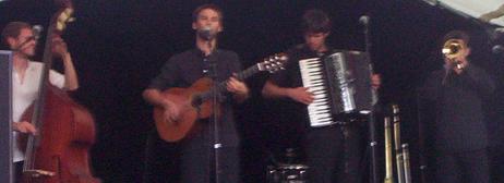 Le groupe monte sur scène, les quatre joueurs des Courirs les Rues, à droite, JB à la trompette, à ses côtés, Olivier au trombone ou à l'accordéon, voisin de Maxime, guitariste, et puis il y a Louich à gauche, qui chante pour une première chanson que l'on ne connait pas, nous qui connaissons le seul album du groupe.