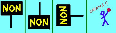 Ca va chauffer encore plus ensuite, mais en attendant, parlons d'un autre délire dont je me souviens (ça fait un mois, j'ai mis du temps à écrire ces mots), ils parlent de Sarkozy, et autres enfoirés .. puis là Gilbert vient avec une grosse pancarte où y'a marqué NON, mais cette pancarte, si on la retourne, ca fait toujours non .. et si on la met de côté, ça fait zoz ... donc ZOZONS ! (traduc : faut dire non !). Un ptit dessin expliquera ...