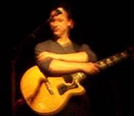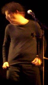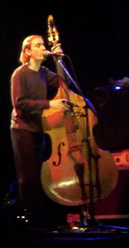Ils arrivent sur scène, un type à l'orgue, un type sur une guitarre (en photo juste en dessous), un autre sur la batterie (en photo tout en bas, à droite de la photo), et un type sur une contrebasse (il la grattera), d'ailleurs ce dernier a une tête qui m'va très bien (c'est lui, là, à gauche), et il est un peu au devant de ses compères, d'ailleurs c'est lui qui commence à chanter. Premiers avis, ce n'est pas un concert basé sur le burlesque (comme l'étaient Wriggles ou surtout gueules de bois), les joyeux sont vach'ment bien sappés, pas du tout déguisés ni rien, et jouent normalement de la musique, et chantent normalement. Bref, c'est un groupe "normal".