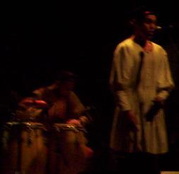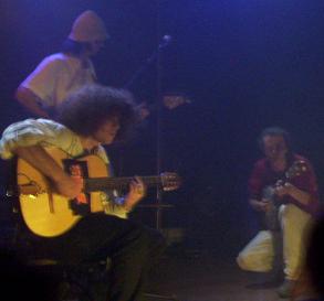 Celui qui nous parle est le percussionniste, qui s'essaiera aussi à de nombreux autres instruments, pas très intéressants dans les dires, faut dire que le public n'est pas trop dedans, puisqu'il y a de formé une sorte de demi-cercle de handball, avec à l'intérieur du demi-cercle, un amateur qui écrit en ce moment ce résumé, et un photographe qui bouge devant le public .. mais voilà, le public mettra quasiment tout le concert à se rapprocher du public ..