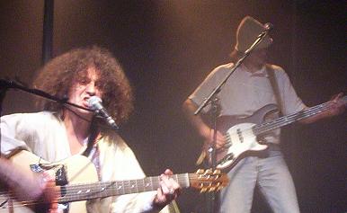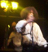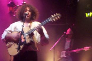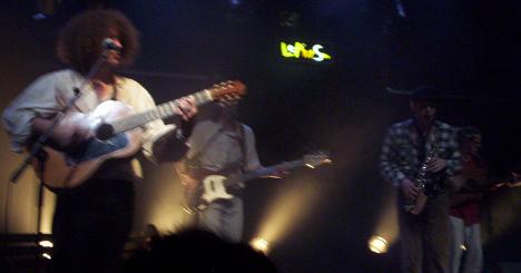 Et ça se voit, car dès qu'ils arrivent, grosse ambiance dans le public, les gens connaissent même les paroles qui sont chantées par un chanteur aux poils chevelus fort élégants, une sacré touffe, qui déjà me plait ! Et ce qui me plait encore plus, ce sont les instruments qui vont se ballader sur scène, d'abord une guitare pour le chanteur dont j'ai parlé depuis le début ..