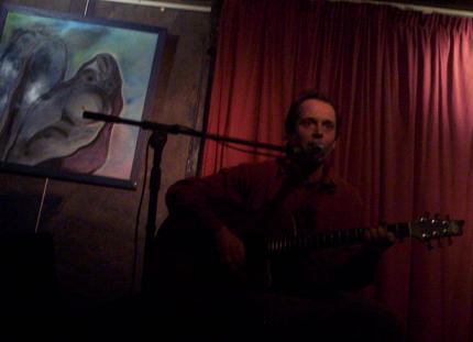 Heureusement, le bonhomme est doué sur scène, il réagit au moindre dire du public, qui était très silencieux ce soir, sauf un type situé proche du bar, qui a commencé à parler avec le chanteur, et Rodrigue a parfaitement enchaîné avec un gros sourire qui fait plaisir... ah oui, il y a aussi toutes les erreurs de Rodrigue qui se paume beaucoup dans ses doigts sur la guitare, j'pense pas que ce soit au niveau des paroles, mais vraiment au son de la guitare et du rythme de sa voix .. enfin, à chaque fois, il se reprend, et ça en devient drôle quand il se loupe quatre fois à la suite, et renonce, résigné ! (sur Goutte d'Eau)