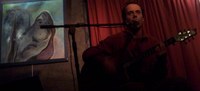 Un petit entracte d'un quart d'heure, le temps de discutailler un peu et de boire aussi, et Rodrigue arrive sur scène, lui, il est Rennais, donc un peu chez lui. Il entre sur scène tranquillement avec une guitare sèche, lui aussi passera tout le concert assis devant le public, lui aussi assis.