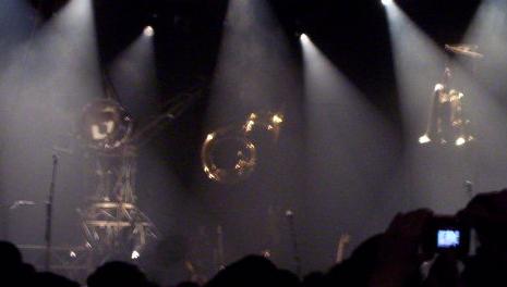 Et voilà l'installation de la scène des Ogres qui vient se mettre en place. Une installation toujours impressionante avec la grue pleine d'instruments qui se dresse sur la scène, mais on voit moins que dans la salle de Sablé .. et rapidement on remarque qu'assis le spectacle offert par les Ogres est largement meilleur .. et que le public présent dans cette salle est très jeune, et qu'il va y avoir quelques problèmes de compatibilité avec le nouveau spectacle ogresque ..