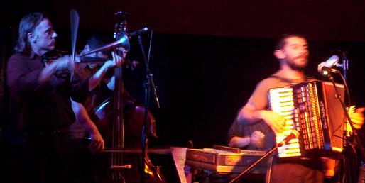 Ca commence assez tranquillement, le rythme n'est pas aussi fou que ça, on entre dans la musique tzigane tout doucement, les chants se font assez discrets, parfois Marc (le sax) s'y met aussi, Olivier prend l'accordéon. Le son des Rageous Gratoons commence à se propager dans le chapiteau, on commence à bouger, puis à danser, il y a une évolution sur les trois premiers morceaux .. le rythme s'accélère toujours un peu plus, le concert se lance ..