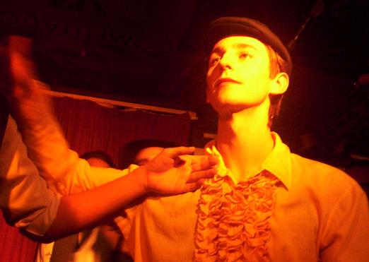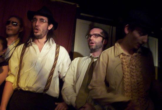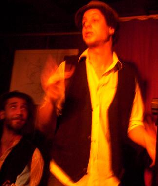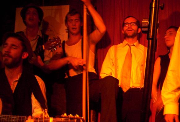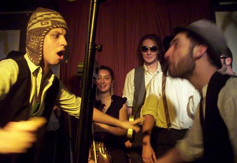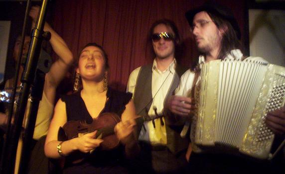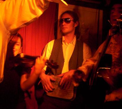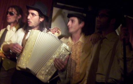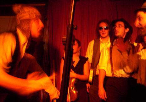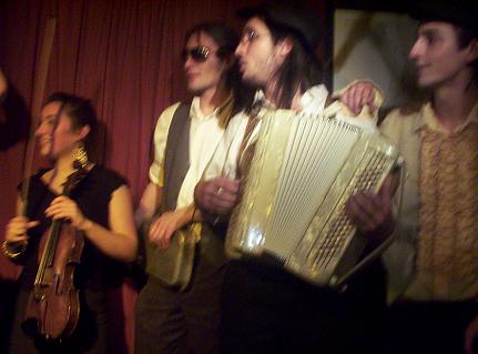 Alors petite description du groupe : de gauche à droite, avec les prénoms si j'm'en rappelle, c'était hier soir : .. ben, zut, j'n'ai même pas le premier .. ah si : John à la derbouka, .. ensuite ... euuuh .. ah, bon quelqu'un à la guitare et assis, à sa droite, Romain, debout avec une guitare, puis un contre-bassinniste, puis Julie la violonniste, puis un gratteur (avec des dés aux doigts et une rape à fromage dans la main) aux dents noires, puis il y a un accordéonniste, Antonin je pense, puis Martin, chanteur, puis enfin un autre guitariste, à la dent noire lui aussi et au bêret : Alexis si j'm'en souviens bien .