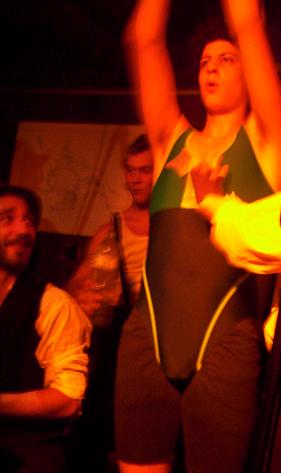 Puis il va y avoir l'histoire d'un haltérophile déchu, Trriiiböörrd, en fait, ça sera Romain (comme par hazard) TrrriBöörrrd, et il viendra, affublé d'une tenue d'athlète totalement ridicule, un maillot de bain une pièce sûrement réservée aux femmes (j'ai des photos). Il viendra acclamer par une foule en, et totalement dedans, délire. Il va arriver, et va se taper la marque de son maillot : Tribord .. hilarant ! totalement n'awak, j'adore !