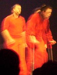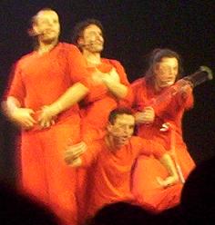 Le temps de me rapprocher de la scène, puisque la salle n'était pas totalement pleine, même si elle était bien remplie, et le concert des Wriggles commençait. Ils arrivent encore tout habillés de rouge, seulement, ce coup-ci, pas de salopettes, et ils commencent à chanter assis sur des chaises roulantes. Autres premières remarques, Stef, celui qui saute partout, a des béquilles, ce qui ne va pas l'empêcher de continuer à sauter partout, mais un peu moins que d'habitude quand même. Aussi, Kristof a laissé pousser les cheveux ...