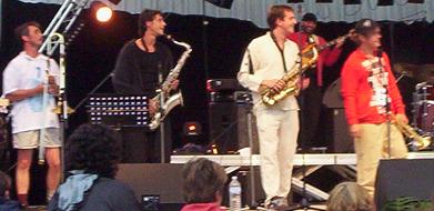 Nous arrivons juste à temps pour le premier groupe, les Trompettes du Mozambique, une fanfare de binious et cuivres, rythmées et sympas, parfait pour démarrer le festival sous le ciel gris. Le groupe, originaire sûrement du coin, n'est pas forcément venu avec ses fans, et ne fait pas trop danser les foules, sauf un ou deux danseurs en plus de lulu et moi. L'ambiance est assez calme ..