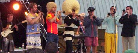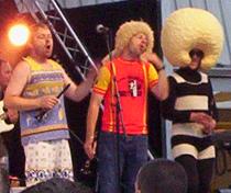 Pourtant sur scène, ils se démènent, tous déguisés, en abeilles, en pijama, en buddha, en marin, en jeune avec casquette de travers, en footballeur, avec des habits classes, tous plus ridicules les uns que les autres, avec des shorts pathétiques, ou encore un biniou man a une perruque assez extraordinaire !