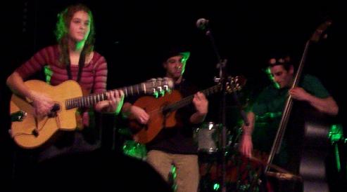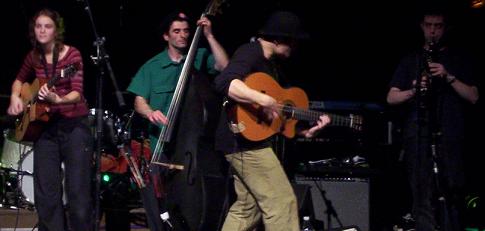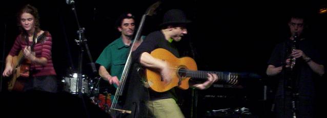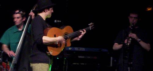 Ses acolytes, la deuxième guitariste, c'est Marie, qui est vraiment charmante (d'ailleurs, certains dans le public demanderont qu'elle reste après le concert, en solo), et qui chante, sourie, et joue bien de la guitare, elle aussi toute jeune. A la contrebasse, alors, il est bizarre, c'est Amine. Pourquoi il est bizarre, car il ne pète pas un seul sourire de tout le concert, alors qu'il dit des conneries, il fait des conneries, mais pas un seul sourire .. trop bizarre .. aussi, il me fait penser quand il joue de la contrebasse à Gweltaz, tellement il bouge. Puis enfin, un peu à l'ombre, d'où le faible nombre de photos de lui, et de photos de qualité, il y a Sylvain à la clarinette, donc lui, il a le bec collé à sa clarinette du début à la fin du concert, donc on ne l'entend jamais parler.