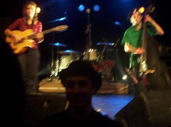 Le groupe, arrivons y vite. D'abord, lui, Mickou, le chanteur, qui joue aussi de la guitare et qui porte aussi le chapeau melon, assez petit (tous les membres du groupe sont assez petits en fait), belle petite voix, tranquille sur scène, il se moque de nous en début de concert, ce qui ne va pas être très drôle, il en fera un peu trop dans la moquerie, dommage, on mettra un peu plus de temps à rentrer dans le concert.