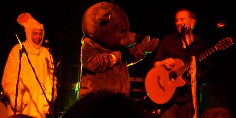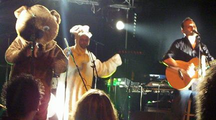 Et voila Pepito qui vient avec un costume de lapin .. ah .. et voila Mr D qui vient habillé en ours .. alors que la musique derrière est plutôt bien trippante. Ca danse, l'ours danse, bouffe son micro, chante. Le lapin derrière s'amuse .. puis, je ne sais plus pourquoi, à un moment, Mr D va agresser Oldelaf de mal lui parler, et alors l'ours D va reprendre Oldelaf, comme on peut voir un flic reprendre un ado qui a fait une connerie (ça te fait rire ? hein, ça te fait rire ?). Avec son déguisement en ours .. c'est vraiment débile, et tellement drôle .. pfouuuu .. à s'en décrocher la machoire.