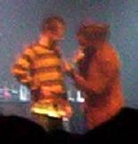 Mais rapidement, ils vont commencer à retirer leurs gros vêtements et montrer leurs nouveaux t-shirts, ils ont tous le même .. Enfin, pour le moment, c'est le rap qui prédomine, ils sont là tous les cinq à se donner la réplique, le son n'est pas super bon, donc là franchement, on n'entend pas grand chose, donc ça fout mal .. surtout qu'ils rappent super vite, donc difficile, impossible de les suivre.