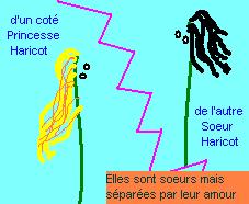 Elle prit un couteau et se dirigea vers Prince Haricot, elle allait le tuer, devant tout le monde elle s'en foutait, mais il fallait qu'elle le tue. Elle s'élança mais quelqu'un l'en empêcha, c'était sa soeur, Princesse Haricot. Le calme sur son visage indiqua qu'elle était fatiguée, qu'elle avait beaucoup pleuré la mort de son père, mais surtout qu'elle ne haïssait pas sa soeur. Son visage était même complice pour Soeur Haricot. Elle lui chuchota dans l'oreille : "Ce n'est pas la bonne solution". Elles s'enfuirent ensemble dans un lieu désertique du palais pour s'entretenir. Princesse Haricot dit à sa soeur : "Pars ce soir avec Voisine Haricot, je vais m'arranger avec le garde pour que vous puissiez vous échapper toutes les deux. Si tu veux la sauver, saute sur l'occasion, si tu ne veux pas la sauver, reste !". Soeur Haricot, le regard reconnaissant et larmoyant, lui proposa : "Viens avec nous, soeurette, enfuies toi !!" .. Le refus était au fond des yeux de Princesse Haricot. Avant que Soeur Haricot puisse commencer le "pourquoi" (si si il était au bout de sa langue), Princesse Haricot fondit en larmes : "je suis enceinte, j'ai une graine en moi ..". Soeur Haricot ne sut que dire, et serra fort contre elle sa jeune soeur.