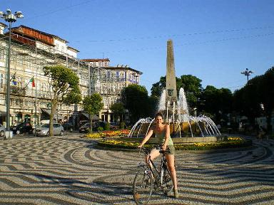 Arrivée à Guimaraes, et là, c'est encore le sport pour descendre les vélos .. et on file dans la ville, on entre dans la cité historique. Avant de continuer la visite, on se fait une petite pause dans un bar de la Praça de Santiago, où l'on observe un peu la mode des jeunes portugais (ça fait peur ...) (1 euro la boisson yeeahh !).