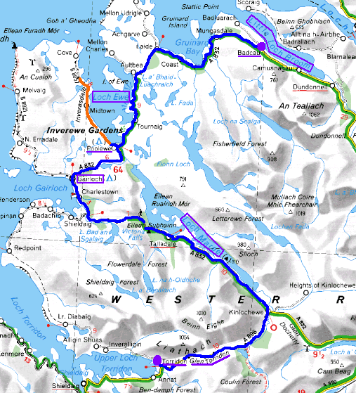 Poolewe au loin, et indiqué par le trait rouge, là où on a laissé notre Joly Jumpy ..